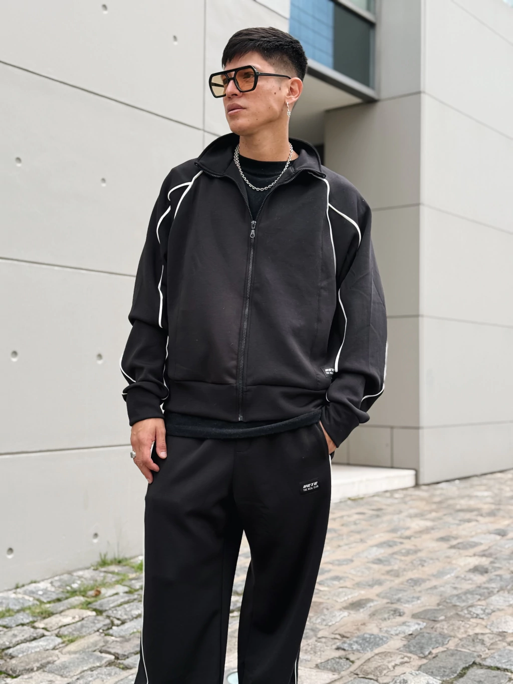 Campera estilo deportivo, con vivos a contra tono, bolsillos laterales y cuello alto con cierre.