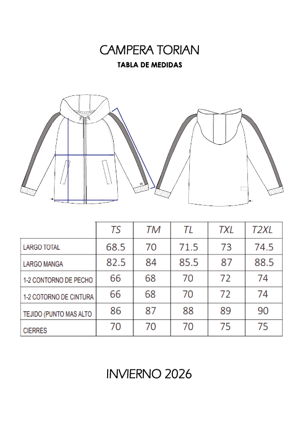 Campera manga ranglan, tejido plano de poplelina, con tirilleras aplicadas a contra tono y capucha amplia. Tancas reguladoras en cintura.