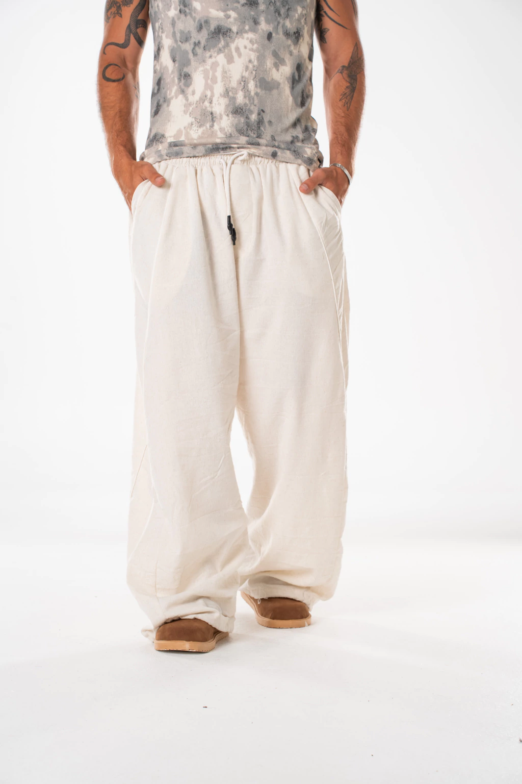Corte recto, amplio. Bolsillos. Cintura regulable.