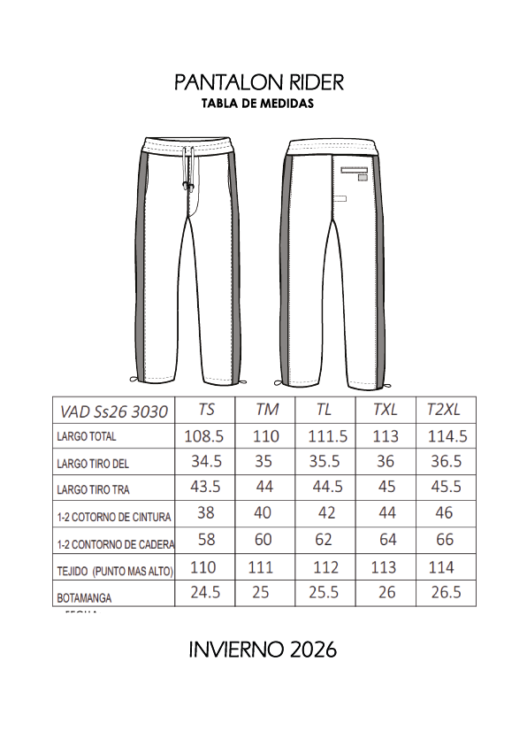 Pantalon Rider, de tela poplin, con tirilleras tejido, bolsillos laterales y cordon y botamanga regulable.